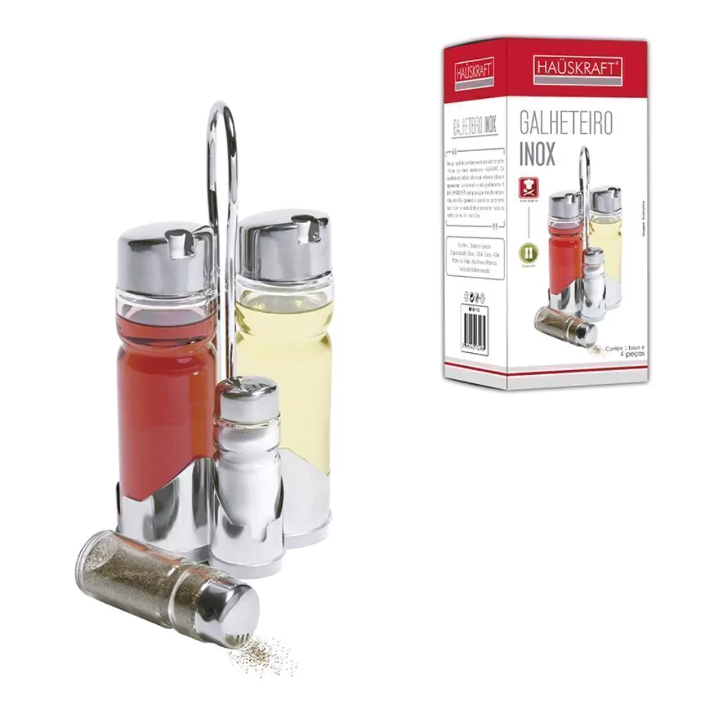 O Conjunto Galheteiro é formado por 1 Azeiteiro (160ml), 1 Vinagreiro (160ml), 1 Saleiro (40ml) e 1 Pimenteiro (40ml). Com um suporte, perfeito para deixar sua mesa muito de apresentar design sofisticado.