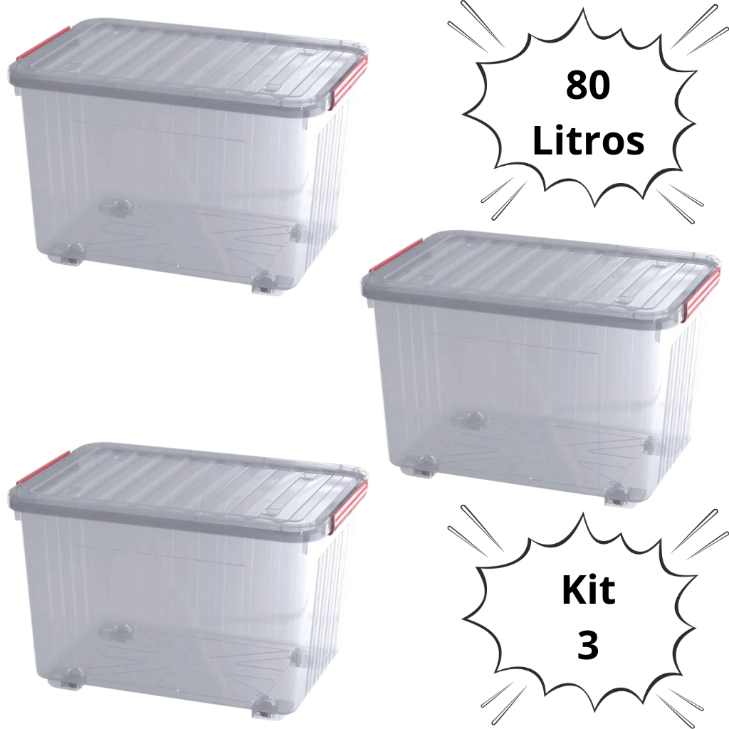 Kit 3 Caixa Organizadora 80 litros com Rodinhas/Rodízios e Tampa e Travas Plástico Polipropileno Multiuso 80l - New Plas