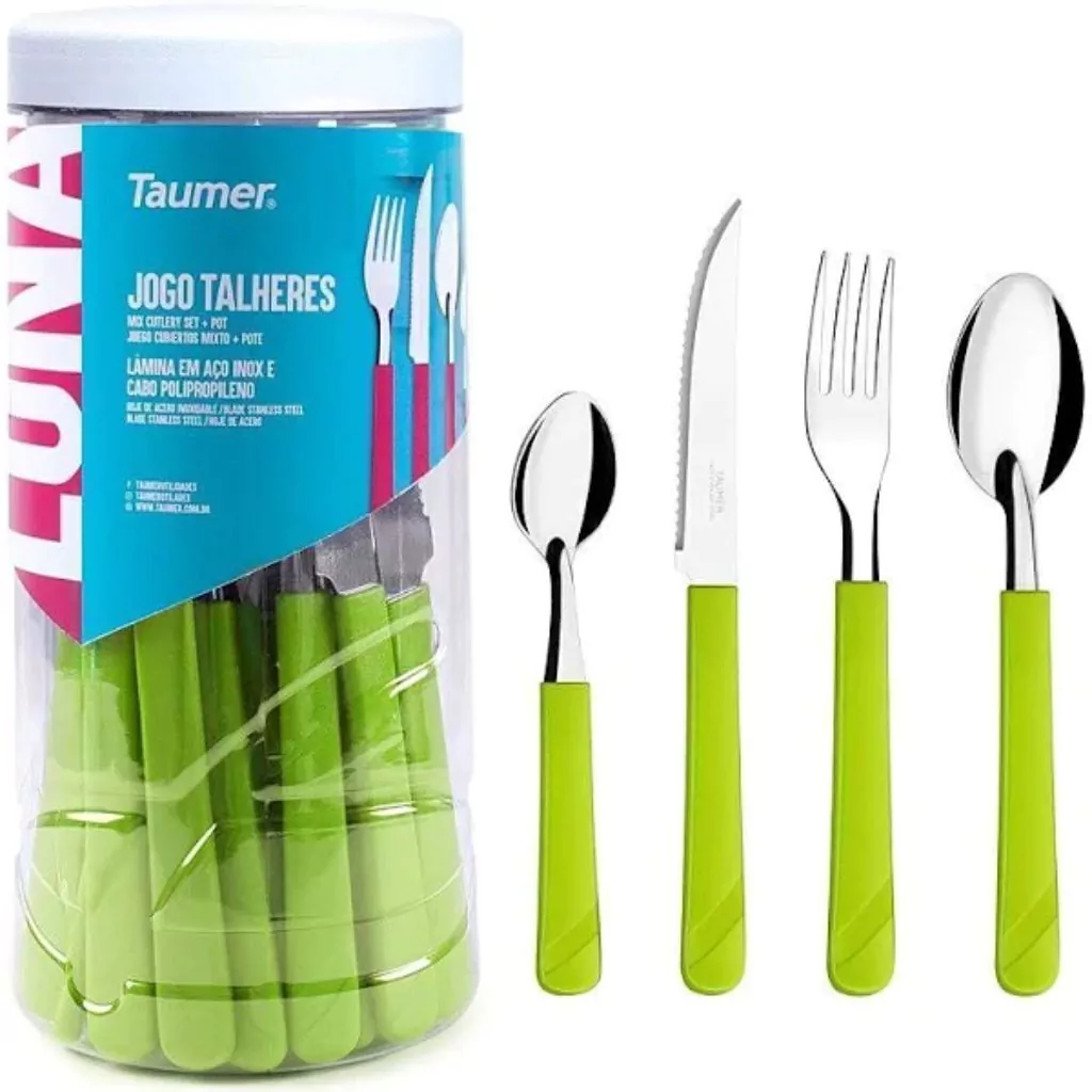 Kit Faqueiro Jogo de Talheres 16 Peças Taumer Luna Aço Inox Cozinha com Pote Conjunto Colorido
