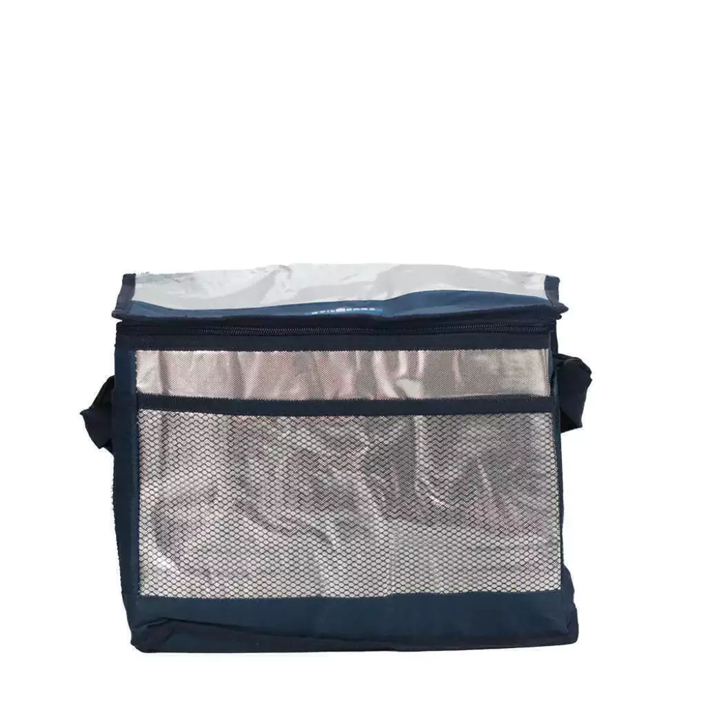A bolsa é feita de poliéster e alumínio, garantindo durabilidade e resistência.