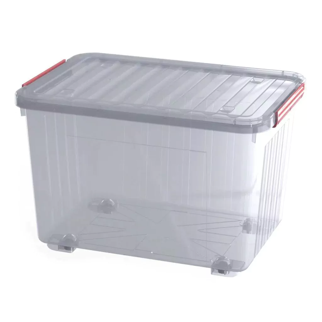 O modelo organizador possui capacidade de 80 Litros e seu material é plástico transparente, com travas e rodinhas para facilitar a movimentação.
