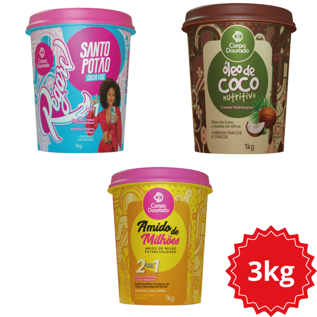 Kit 3 Creme 1kg Corpo Dourado: Transforme Seus Cabelos em Obras-Primas da Beleza!