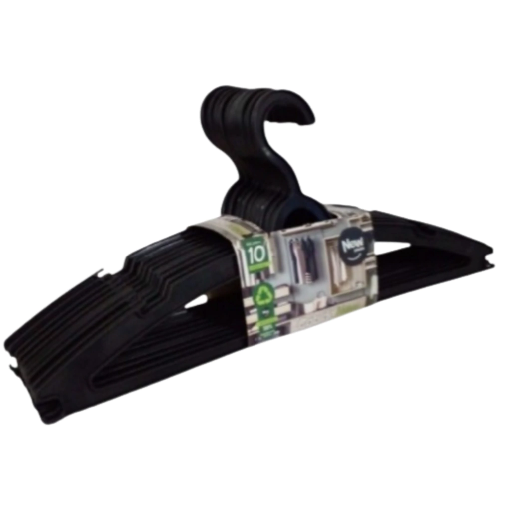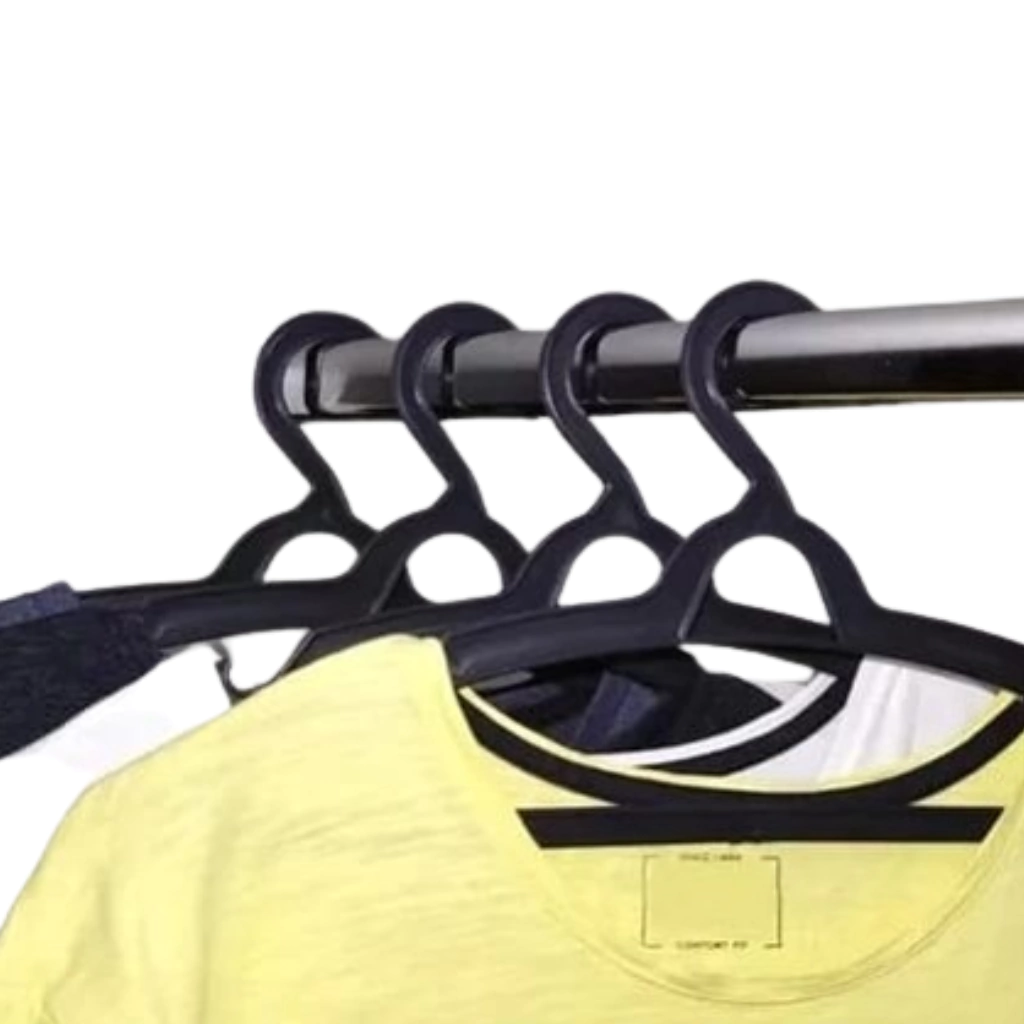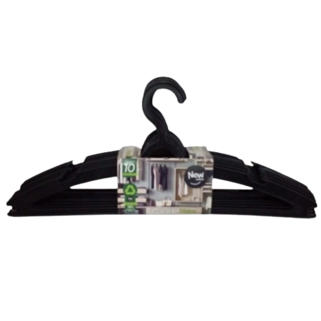 Organize seu guarda-roupa de forma eficiente e sustentável com este kit de 50 cabides plásticos pretos, feitos com plástico reciclado.